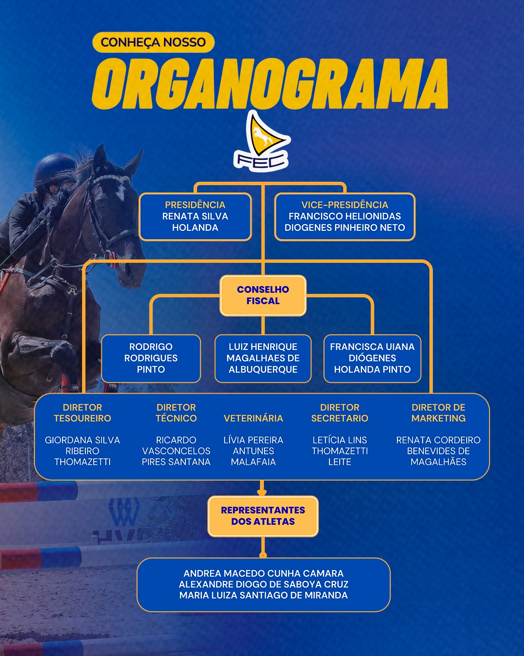 A Federação Equestre tem o orgulho de apresentar a nova diretoria ja em atuação, com as mudanças no site, instagram e procedimentos.