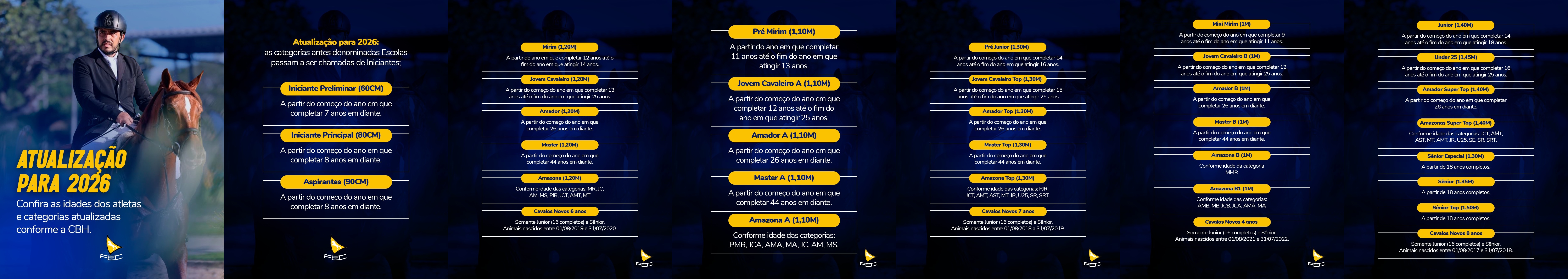 Confira as categorias e faixas etárias dos atletas, conforme o regulamento 2026 da Confederação Brasileira de Hipismo (CBH).
